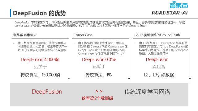 对于DeepFusion技术,由于它的信息中每个通道的不冗余性,最终导致算法对数据的依赖会极大的降低。在我们的数据集中,我们做了一个简单的测试,DeepFusion采用前融合的算法,我们大概采用1万帧左右的算法,能得到传统算法10万帧的效果。除了Corner Case以及数据集的远远减少以外,DeepFusion还有其他的一些Benefits。比如采用DeepFusion的数据集是可以当做来L2、L3的Ground Truth,你在出去标注的过程中,需要标注一次,那么你会完成对所有数据的标注。