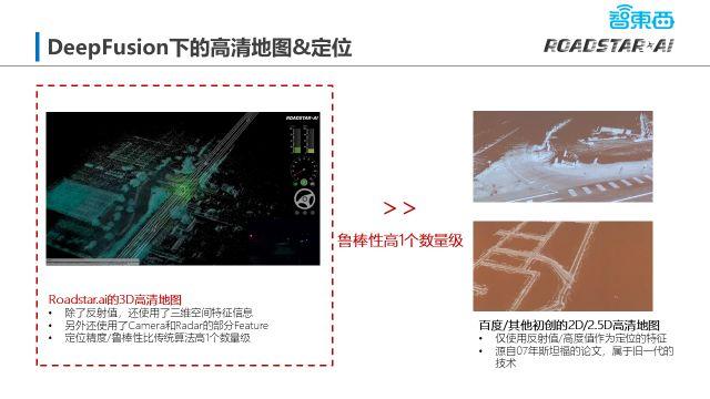 而GPS是很容易被大功率的信息,尤其是被1.3G或者1.5G的信息所干扰劫持。如果只是靠GPS和IMU融合,是不足以实现无人驾驶的。Roadstar是采用了基于高精度地图的定位解决方案。基于高精地图的解决方案,你的定位并不会因为被GPS信号干扰以及磁场干扰而受到影响。因为你是在地图中找到你真实的位置,所以这是一个非常鲁棒的方案。当然基于地图定位的方案和GPS融合能得到一个更好的效果。