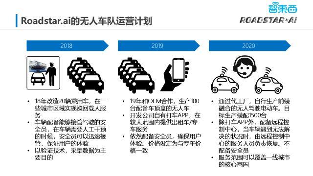 之后我们会做无人车队运营。在2018年,我们在深圳会铺20辆乘用车,每个车辆配备一名安全员做一些数据的收集以及技术的验证,向政府证明Roadstar可以安全地做到车辆的运营;2019年我们会跟车厂或者是Tier1进行合作,生产100台无人车,同时跟出行公司或者是自己开发打车软件,提供比较大范围的出租车或专车服务。当然,在2019年我们依然会配备安全员,保证用户的体验。