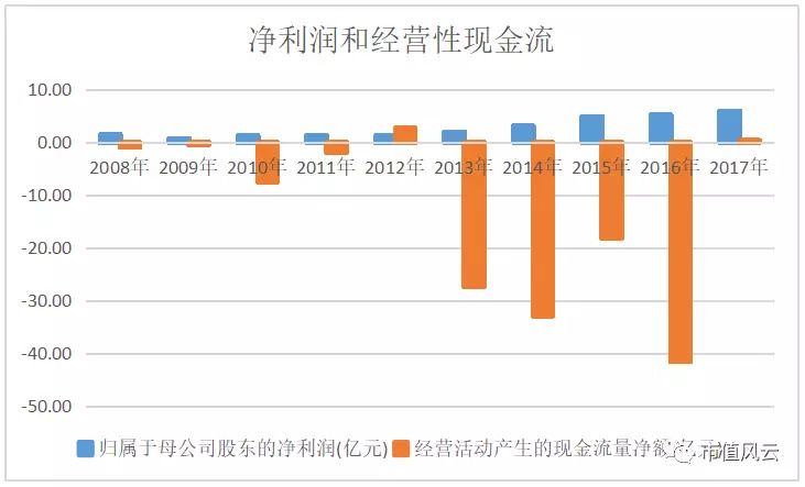 具体来看,这十年里有八年经营性现金流量净额为负数,其中以2013至2016这四年最为恐怖,分别为-27.19亿、-32.8亿、-18.05亿、-41.47亿,共计-119.51亿。
