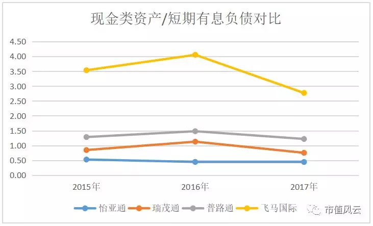 下面我们将怡亚通、瑞茂通、普路通、飞马国际4家A股供应链公司近三年的现金类资产/短期有息负债进行对比: