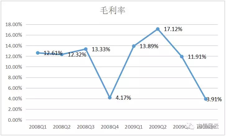 先看2008年,一季度到三季度毛利率都比较平稳,在12.5%左右波动,但到了四季度,毛利率剧烈下滑到4.17%,2009年也如出一辙,毛利率在第四季度出现大幅下滑。