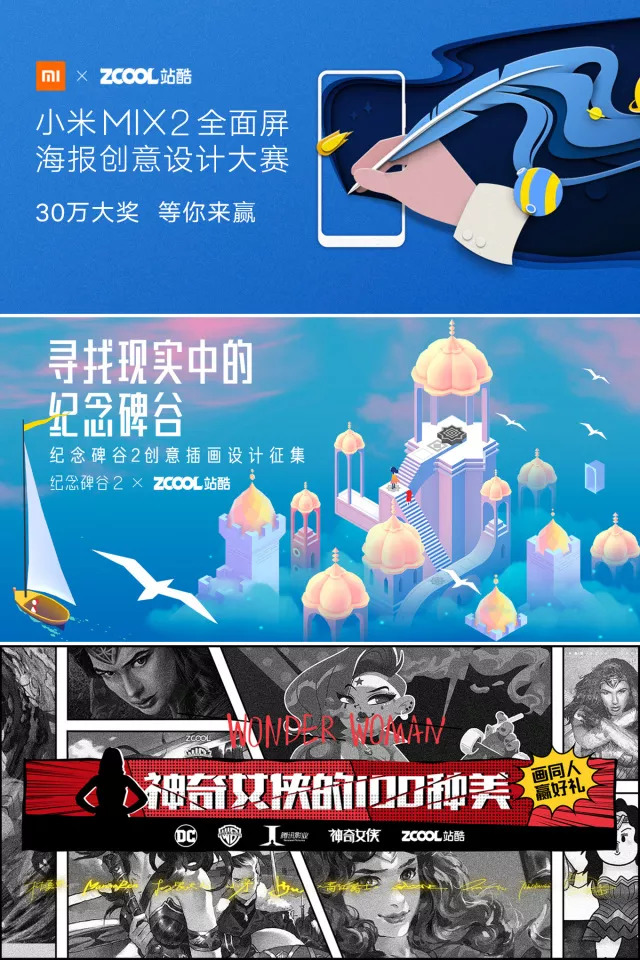 梁耀明介绍,汽车、快消、手机类的品牌是设计大赛中的常客,其中不乏小米和腾讯游戏这样的知名品牌。2017年,小米和腾讯也延续了与站酷的合作关系,联手举办了MIX2全面屏海报创意设计大赛、纪念碑谷2、王者荣耀、冒险岛2、欢乐斗地主、神奇女侠等项目的设计大赛。