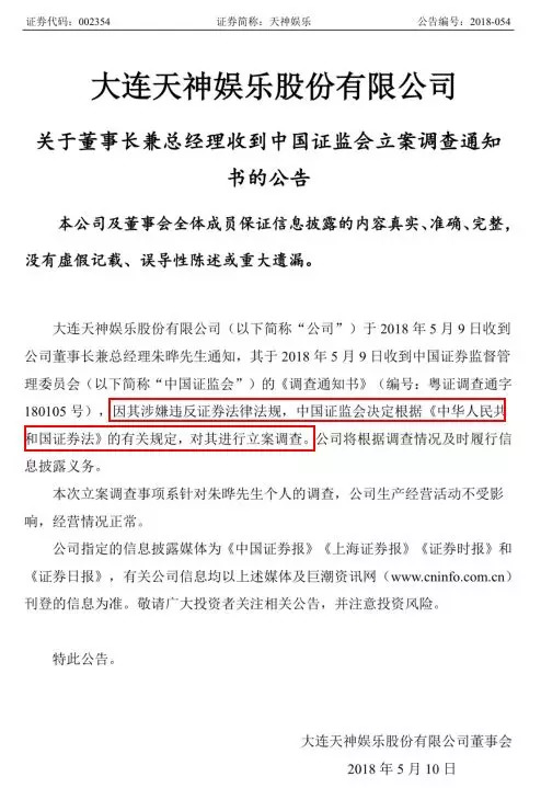 5月10日晚间,上市公司天神娱乐(002354)公告称,其董事长兼总经理朱晔于5月9日收到证监会的《调查通知书》,因其涉嫌违反证券法律法规,对其进行立案调查。