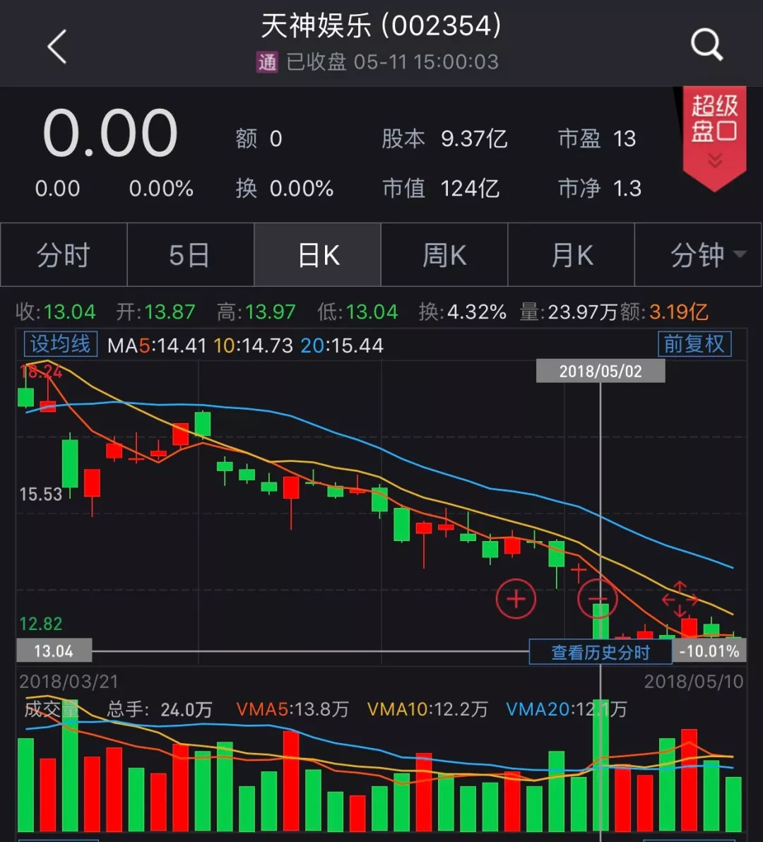 在今年3月证券时报统计的跌破增发价的定增股中,天神娱乐现身。数据显示,天神娱乐的2015年12月9日定向增发价格为78.26元,而最新收盘价仅13.2元,大跌超80%。