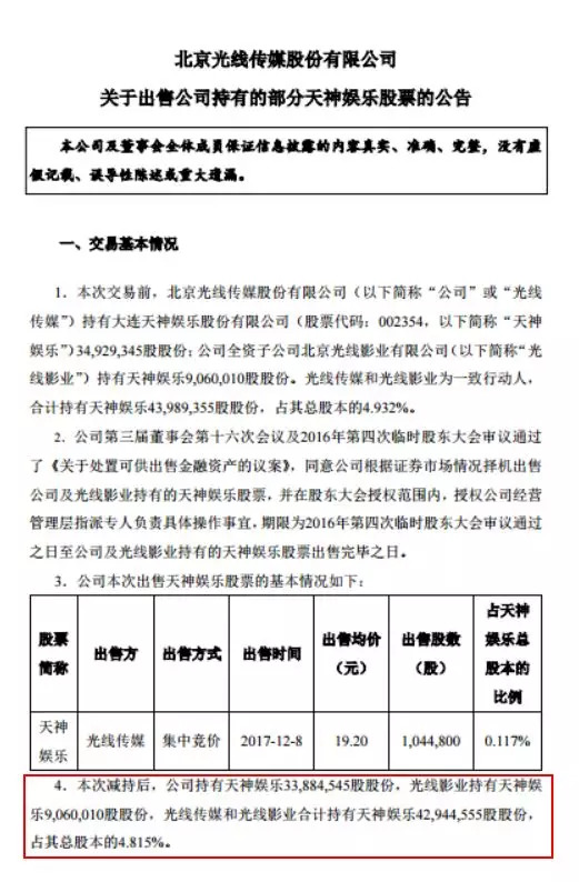 5、遭十大股东之一的光线传媒减持