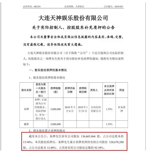 5月3日和10日,天神娱乐发布了朱晔的股份质押和补充质押公告,两次分别质押所持股份495万股和200万股。截至5月10日,朱晔累计质押所持股份约1.207亿股,占公司总股本的12.88%,占其所持股份的92.39%。