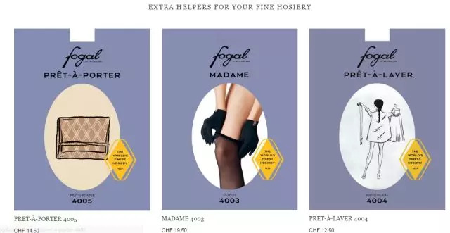 同为全球顶级丝袜的四大王牌之一的FOGAL品牌成立于1920年,至今也有90多年历史了。从瑞士的第一家店到如今在全球的68家分店,FOGAL已经成为了高质袜子的代名词。它倡导健康、时尚、高雅的生活理念,主打色彩一直都是它的闪亮点,光是各式袜裤的常备颜色变高达82种。