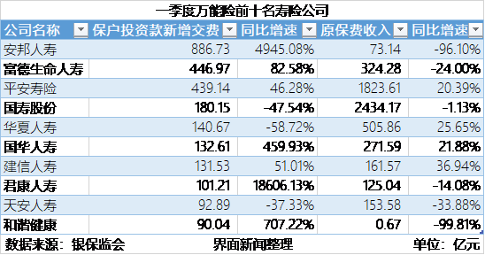 界面新闻整理出了原保费收入前十名的寿险公司,与2月份的名单相比,新华保险上升1名与富德生命人寿对调,其他公司名次无变化。国寿股份仍然稳坐龙头宝座,比平安人寿多出600多亿原保费收入,但是增速同比略微下滑1.13%。