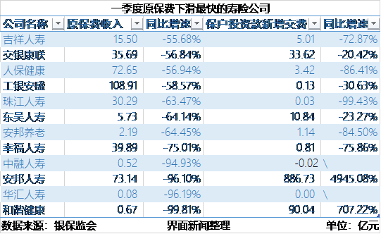 随着银保监会披露前3月保险业经营数据,今年险企开门红表现一览无余。不出市场预料,寿险公司原保费收入同比下滑,一季度实现原保费收入10993.96亿元,同比下降16.82%。