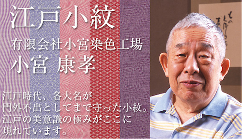 小宫康孝生于1925年,1978年继父亲小宫康助之后被评为“江户小纹”这一重要非物质文化遗产的技能保持者。他从小受父亲的严格指导,技术精湛,将著名花样“极鲛”、“极通”发展得更为精致。
