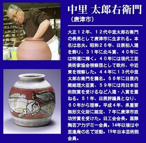 中里太郎右卫门是诞生于公元16世纪末、至今已有400多年以上历史的中里家唐津烧窑的第十三代传人。“押印”是古代唐津烧成形时运用的独特技法,曾一度失传,后在中里家第十二代传人手中得以重见天日。二战后,中里太郎右卫门从部队复员,和父亲及弟弟过着“半农半工”的生活,研究古代唐津烧的陶片,反复练习烧制方法。