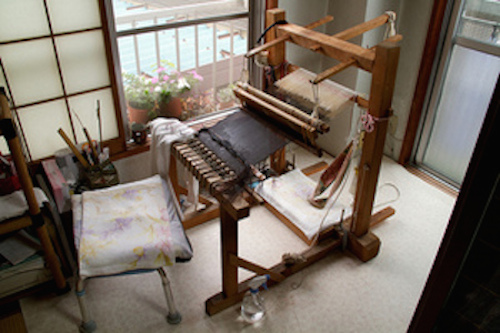 田房染织是武藏村山市现存唯一一家仍然在制作村山大岛捻线绸的店铺,田代隆久是第三代传人。村山大岛捻线绸的制作工艺被称作“絣染”,即先给经线和纬线染色后织布。