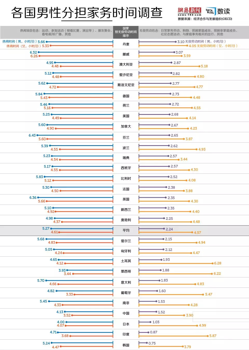 各国男性分担家务时间,中国远低于平均水平