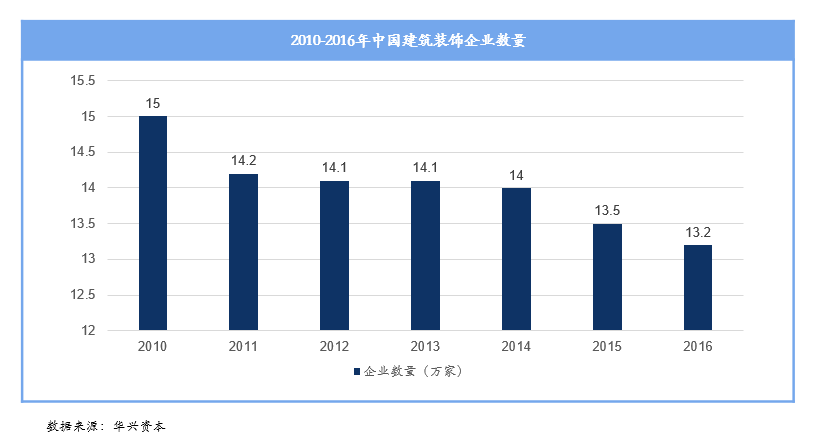总体来看,我国建筑装饰行业呈现完全竞争的市场状态。其中,一个显著的特点就是行业内企业数量众多。根据中国建筑装饰行业协会官方网站发布的《2016年中国建筑装饰行业发展报告》,2016年全行业企业总数约为13.2万家左右,比2015年减少约0.3万家,降幅2.22%。退出市场的竞争者主要是在三、四线城市以散户住宅装修装饰为主的小微企业,有资质证书的企业退出市场的例子极少。2016年新增有资质的企业约6000家左右,行业内有资质的建筑装修装饰工程企业数量在91000家左右,有资质企业的比例达到68.9%。