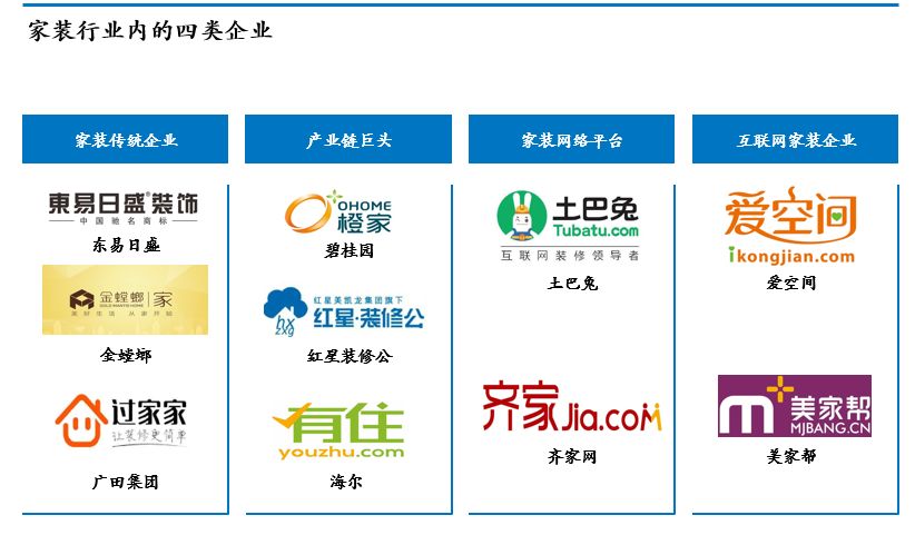 第二类是涵盖装修产业链上下游的,如涉及开发商、建材商、中介公司、家电公司等企业,这些产业链巨头也纷纷利用各自的优势成立了装修公司进入家装市场。如海尔集团旗下的互联网家装品牌——有住;房地产巨头碧桂园旗下的互联网家装品牌——橙家。