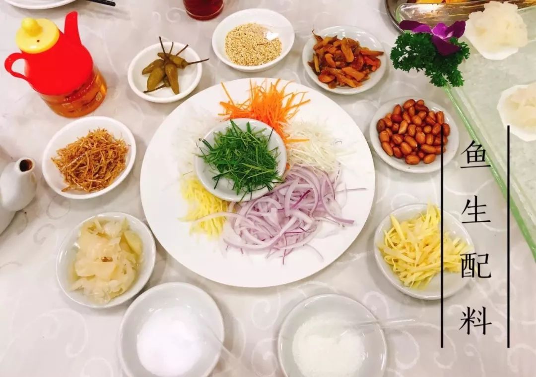 鱼生处理的毫无腥味,配料也非常多,胡萝卜丝、洋葱、柠檬叶、葱丝,还有榨菜、芋头丝等,拌上鱼生,加一点盐,味道就足够令人惊艳!