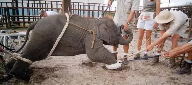 长时间肉体和精神上的折磨后,驯象师会开始喂他食物,骑在他的背上,训练他做指定的动作。不听话的小象就要被不断地惩罚,饱受精神与身体上的摧残。在这个过程里,有些小象会被活活折磨致死!