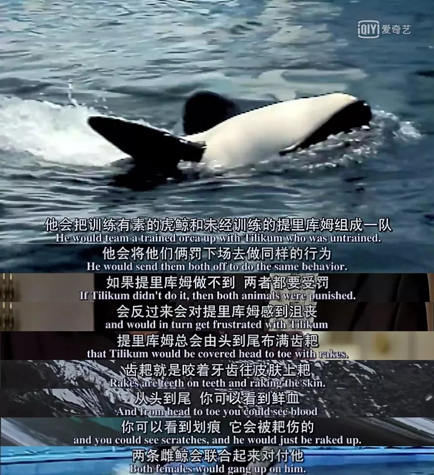 有太多被困住的动物们,像Tilikum一样被压迫与束缚,最终做了最坏的选择——伤害人类。而在这之前,它渴求自由又沮丧地找不到出路,只能一整天漫无目的地游着,或是找一处角落一动不动。