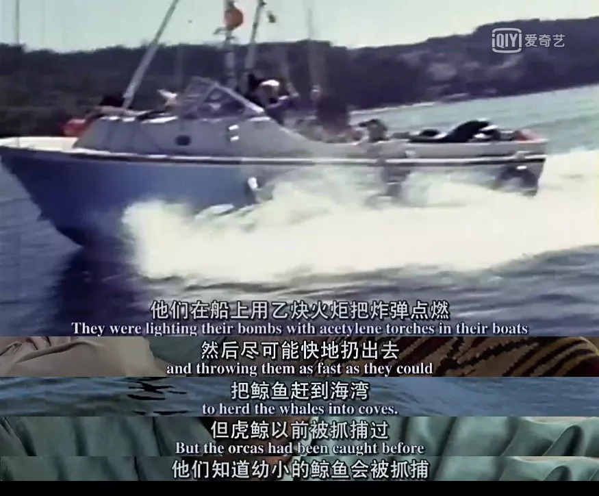 开片十分钟就讲述了捕鲸人抓捕虎鲸的过程,成年雄虎鲸自愿当诱饵掩护雌虎鲸和幼鲸,和它们分开两个方向游去,但还是躲不过捕鲸队的飞机,他们只需要发出号令,快艇就会快速朝幼鲸的方向驶去,将它们一一捕获。