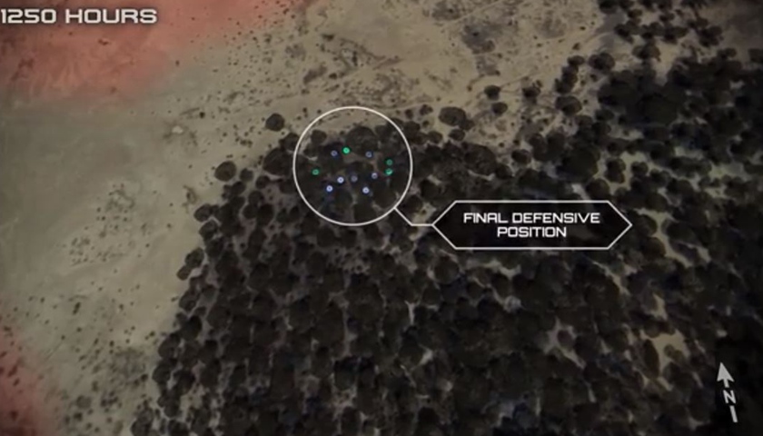 向西北方向撤退的美军车辆在驶入灌木丛中后陷入泥潭,此前试图寻找布莱克三人的四名美军在发现车辆后,成功与大部队汇合。此时,小队才发出第一个求救信号,当时距离小队遇袭已经过了近一个小时。为避免无线电通讯系统落入ISIS之手,小队在发出信号后便摧毁了通讯系统。