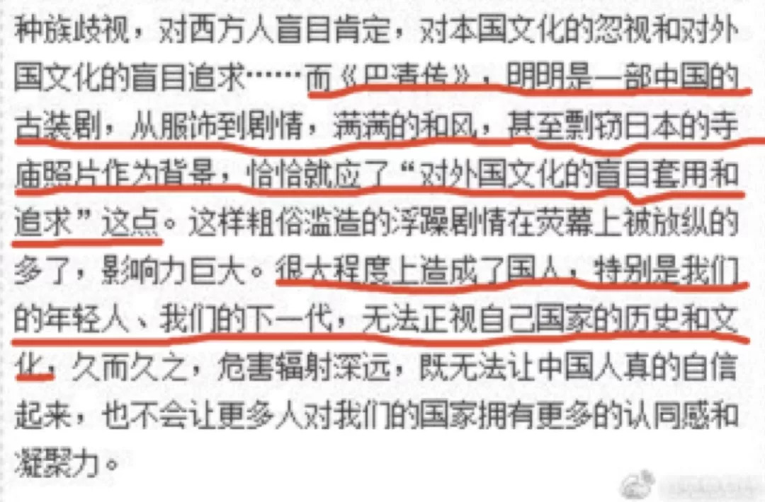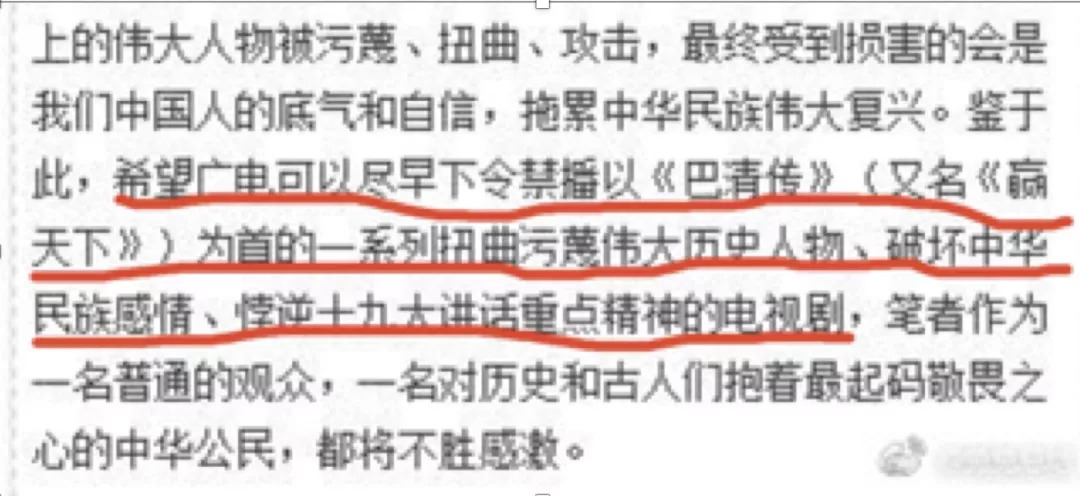 原来改了名的《巴清传》遭到了秦朝迷的万字长文举报,控诉《巴清传》歪曲历史,服装涉嫌模仿日本服饰等等多宗“罪状”,并直接艾特广电领导“早日下令禁播《巴清传》”。