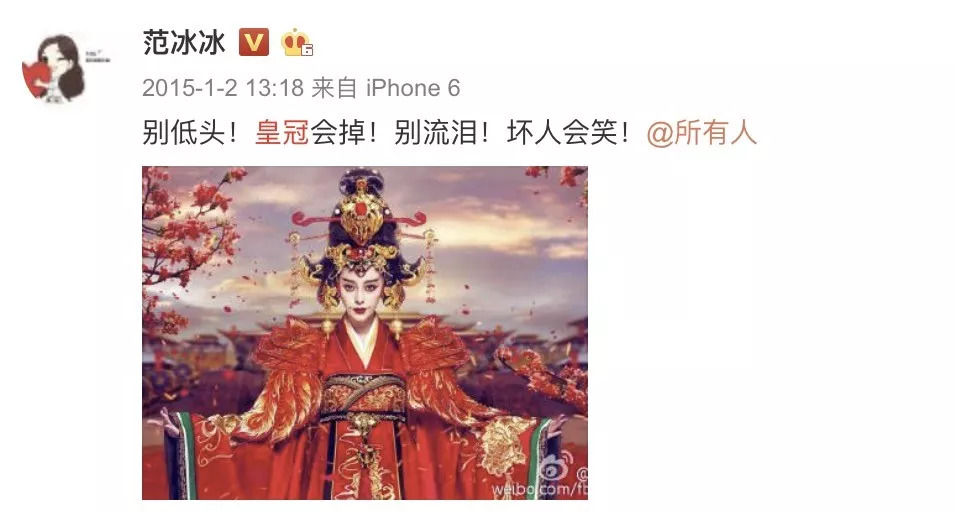 不光观众看得窒息,更白瞎了《武媚娘》剧组斥巨资的3000多套服装,身兼主演和出品人的范冰冰的心塞隔着微博客户端都能感受到,还因此创造了这神句。