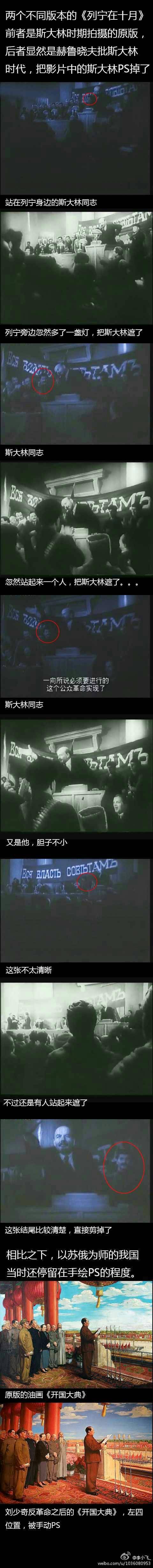 政府变动剧烈的国家,主旋律电影变动也剧烈,比如中国人特别熟悉的电影《列宁在十月》,拍摄于斯大林时代,表现斯大林英勇辅佐列宁完成十月革命的故事,但在赫鲁晓夫时代,斯大林被批倒批臭,于是出现了另一个版本的《列宁在十月》,凡是影片中出现斯大林时,必然出现一位站起的群众演员,或者前景花瓶之类把他挡住(见下图)。这让人想起某幅油画被重画了N次的典故。当然这也属于A类主旋律电影。