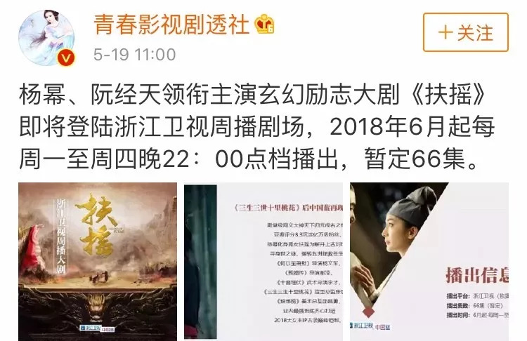 5月19日,微博博主@青春影视剧透社爆料,杨幂的《扶摇》将于2018年6月起在浙江卫视周播剧场播出。作为对比,去年杨幂主演的《三生三世十里桃花》可是在浙江卫视黄金档播出的,而现在,黄金档宁可给邓伦和李一桐等新人主演的年代剧《海棠经雨胭脂透》,也没有留给大幂幂的《扶摇》,也可见古装大剧地位的下降。