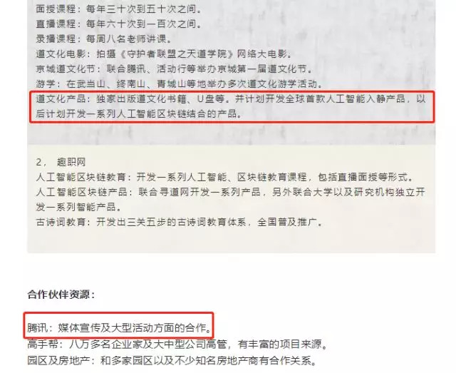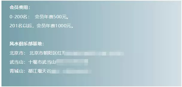 「联合腾讯举办京城第一届道文化节」上述道家风水俱乐部的培训课程的介绍文案如是写到。氢媒工场还注意到,该风水俱乐部价格不菲,0-200名的会员年费需要500元,而201名以后,会员年费1000元。(入会后课程费另计)