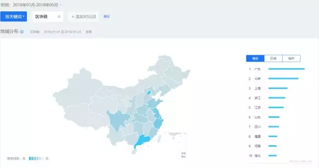 这种认知程度两级分化的现象也体现在城市中。氢媒工场查阅百度指数发现,2018年1-5月各省份区块链的搜索指数严重不均,北上广搜索指数份额最高,而其他城市随排位降低,搜索指数急剧下降。