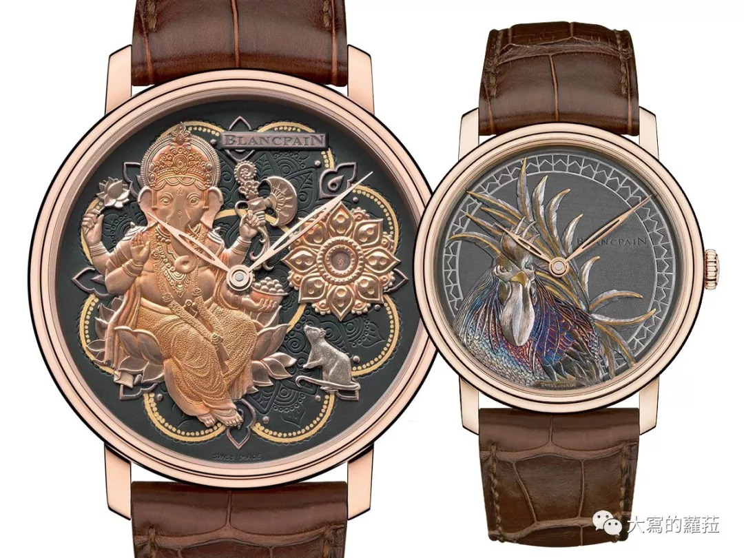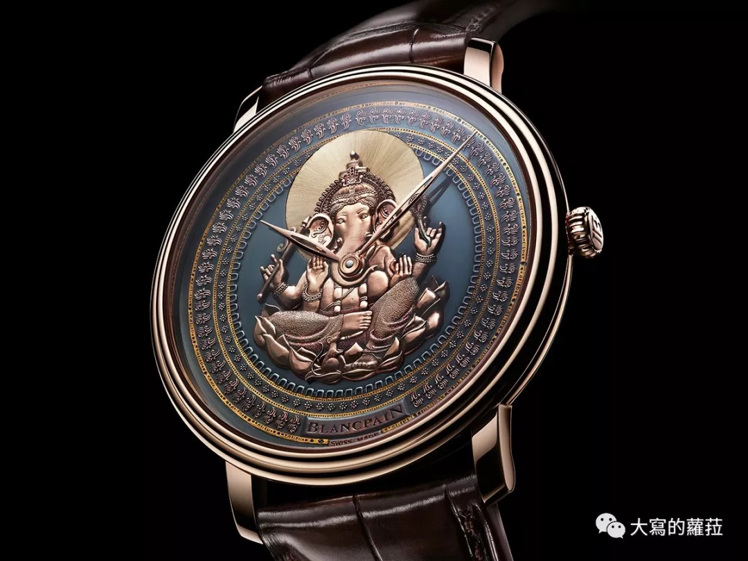 宝珀Villeret经典系列的艺术大师款式上出现过几次不同的图案,其中印度象头神款式最著名且手法最繁复华丽,且在象神边缘的圆周环上以大马士革技法嵌金装饰,使得整体面盘的华丽感顿时上升至印度皇室的金璧辉煌。