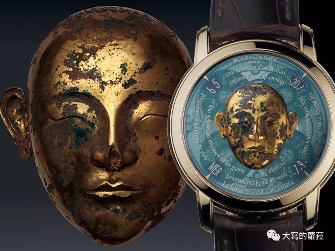 于是江诗丹顿寻找到了“类似古铜的金”做部分面具的创作,并且使用镀锌加上史料中找寻到的化学配方,加以表面处理,重现出温暖又特殊的合金色调。另外为了恢复某些面具原作的历史沧桑效果,甚至开发出一种铜绿效果的表面处理方式:以铜质堆积在黄金材质上,加以氧化创造出铜绿的效果。