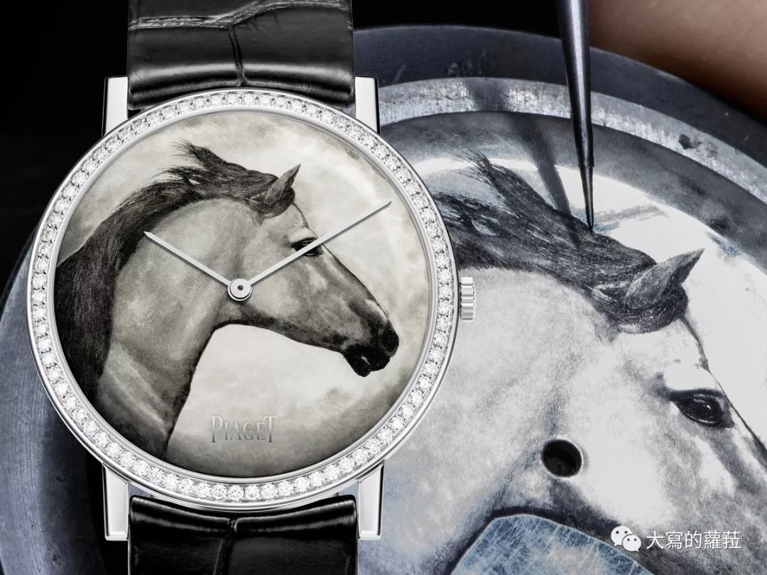说到金雕染色,我又回想到Piaget伯爵邀请金雕师Richard Maier合作的几款金雕墨染图案面盘,每一款都让人屏息惊艳。这种微雕方法必须先由雕刻师在金属面盘上以针形雕刀进行雕纹,并且使用特殊深墨借由微雕图腾的深浅层次,晕染出深浅不一的色阶,而这种古老的技法可以推前至古文明时期,人类以雕刻与墨染的方法记录生活,这样的技法发展到今天,已经几乎无人可以再操作,就算有,也少有人和Richard Maier的技法一样细腻精心。