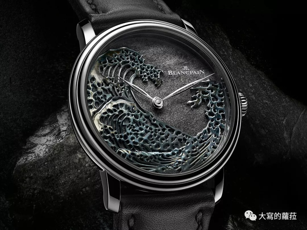 话说回到宝珀在经典系列的艺术大师款式的创作上,最令人激赏的除了2015年的象头神款式外,同样使用金雕与Shakudo技法的还有2016年发表的神奈川巨浪腕表款式,其使用墨西哥银曜石为底座,上方白金材质立体神奈川巨浪图案由宝珀表厂的工艺师金雕完成,这个立体的神奈川巨浪透过金雕、煮色处理在加上精细的打磨与后制处理,巨浪的磅礴、浪花泡沫的生动细腻,已经超越了原本赤铜只是在金属颜色处理上的工艺技术,以暗黑层次表现出神奈川巨浪的丰富灵魂性,这也是这件作品在看似平静却又暗潮汹涌的细节表现最引人入胜之处。
