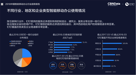 具体来看,钉钉的服务范围已经覆盖全部一级行业和全部96个二级行业,从超大型企业到微型企业在内的全部企业类型,而且各企业类型的增速都非常显著。上门服务也覆盖全部334个地级区划(市)。作为中国原创的移动互联网产品出海,钉钉启动国际化半年时间,钉钉用户已经覆盖195个国家和地区,活跃用户数增长400%,组织数增长500%。