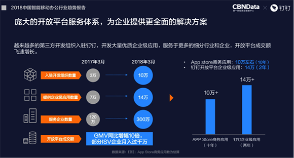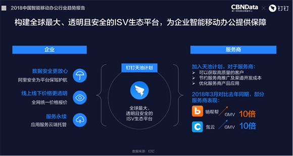 作为平台,钉钉一方面建立了以用户数据安全为核心的平台管理规范,服务商不得以任何形式进行擅自保存、展示、聚合、泄露、使用或授权他人使。另一方面建立共创机制,通过产品赋能、技术赋能和渠道赋能助力第三方合作伙伴,更好地服务用户。钉钉正在构建全球最大、透明且安全的ISV生态平台“天池计划”。在这里,数据更安心,线上线下的价格更透明,ISV可以获取高质量的客户、节约服务商推广及渠道开发成本、优化服务商产品应用。在“天池计划”下,越来越多的ISV势头强劲,如销帮帮、氚云,在2018年3月的GMV对比去年同比翻了10倍。