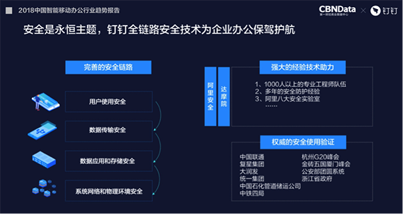 “用户数据安全和隐私保护是钉钉的生命线,”钉钉安全负责人罗锋(花名迦卢)介绍,钉钉对于用户数据安全和隐私保护的自信,源于阿里安全部1000多名资深安全工程师为其做保障。钉钉的全链路安全技术,就是从用户的手机或是PC端接触到钉钉,到数据传输过程,再到数据应用和存储,最后包括系统网络和物理环境,整个过程都得到高标准安全防护。