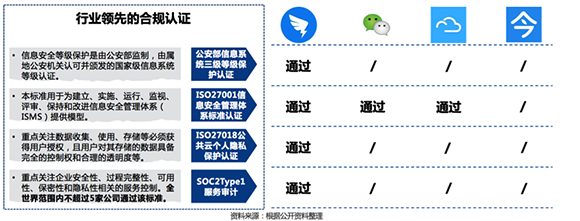 因此安全已经成为智能移动办公的行业核心竞争力。以钉钉为例,今年4月,在普华永道出具的SOC2Type1服务审计报告中,钉钉通过了安全性,保密性和隐私性三项原则的审计,通过隐私性原则审计,钉钉在国内是第一家,全世界范围内不超过五家。而且,钉钉是中国首个通过国际信息安全领域的ISO27001:2013认证的企业级社交产品,也获得了ISO27018:2014(公有云体系下的隐私保护)证书,钉钉还通过了中国公安部的“信息系统安全等级保护”三级认证。这四项权威安全资质的获得,使得钉钉在安全性方面遥遥领先其他同类产品,在用户隐私数据保护方面,可以说做足了功夫。
