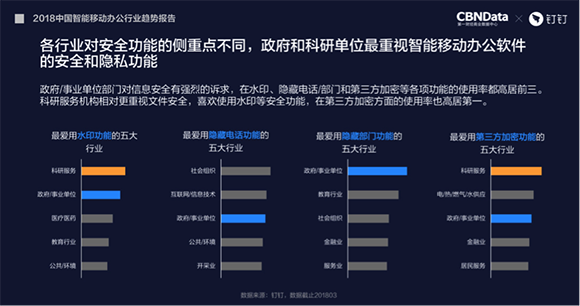 不过各行业对安全功能的侧重点有所区别,最重视移动办公软件的安全和隐私功能的莫过于政府和科研单位。其中政府/事业单位部门在水印、隐藏电话、隐藏部门和第三方加密等各项功能的使用率都位居前三。科研服务机构相对更喜欢使用水印、第三方加密等安全功能。