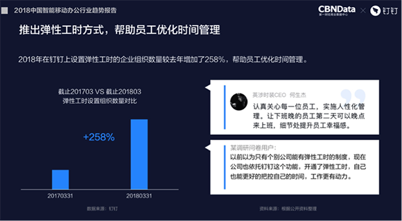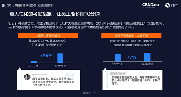 这样的人性化功能也得到了来自企业和员工的强烈响应。《报告》发现,对比2017年,2018年开通极速打卡的组织数增加319%,上设置弹性工时的企业数量也增加了258%,看来越来越多的企业希望为员工提供更多自主控制的时间。工作更有动力,创造创新力更高,效率自然也更高。