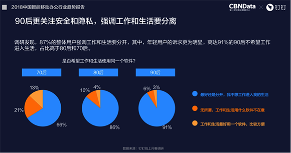 根据钉钉线上问卷调研发现,77%的用户不希望领导或者同事在聊天软件上聊工作,认为用聊天软件工作,在安全性、方便程度方面存在隐患,36%的80后以及46%的90后觉得聊天软件聊工作影响了自己的生活。此外,87%的用户强调工作和生活最好还是分开,其中年轻用户的诉求更为明显,高达91%的90后不希望工作进入生活,占比高于80后和70后。