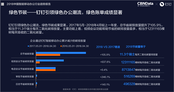 智能移动办公促进无纸化,更为绿色环保;《报告》发现,以钉钉为代表的智能移动办公正在引领绿色办公潮流,绿色节碳的成果也颇为显著。