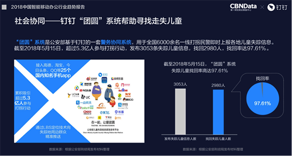 除了绿色环保,智能移动办公企业还在致力于提高社会协同效率。比如公安部基于钉钉打造的警务协同系统“团圆”,旨在通过让全国各地打拐民警第一时间上传失踪儿童信息,并通过新媒体及时推送给周边群众的方式,实现警民联动快速寻找和侦破案件。截至2018年5月15日,团圆系统共发布失踪儿童信息3053条,找回2980人,找回率为97.6%。