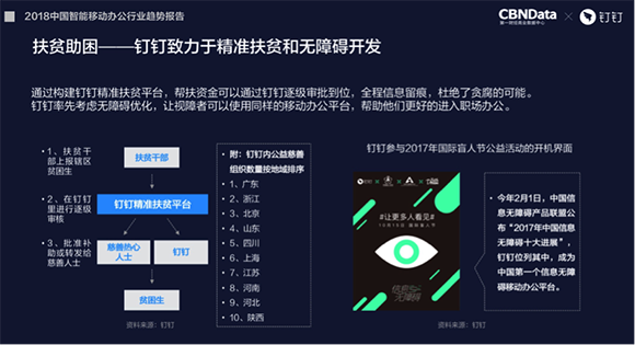此外基于钉钉构建的精准扶贫平台,在陕西、海南、河北、贵州等多个地方实现了精准的扶贫助困。钉钉在信息无障碍开发方面走在了前列,今年被中国信息无障碍产品联盟评选为中国第一个信息无障碍移动办公平台。而浙江省基于钉钉政务平台开展的“最多跑一次”改革,实现了覆盖80%以上的行政事项,有效提高公共事务办理效率,大幅提升了群众办理相关事务的便捷度和幸福感。