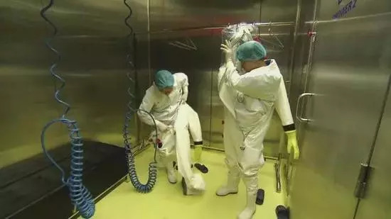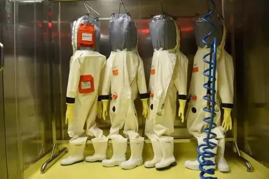 除此之外,研究人员的服装是特制的正压防护服,防护服头部是一个透明的充气罩,而下面则连接着一条呼吸管道,以此保证研究者在呼吸时是在防护服内进行,而不与外界空气发生接触。在研究者出来后,还要进行法学淋浴,以此杀灭可能沾染的病毒。