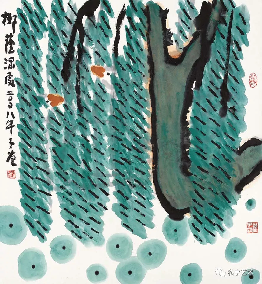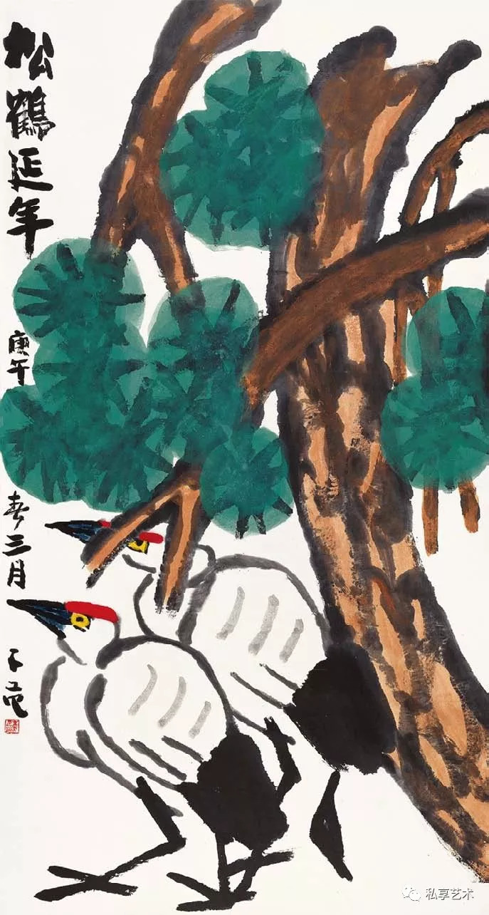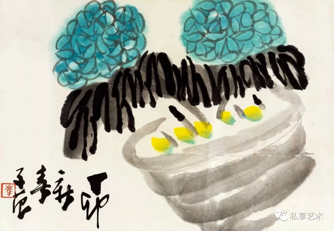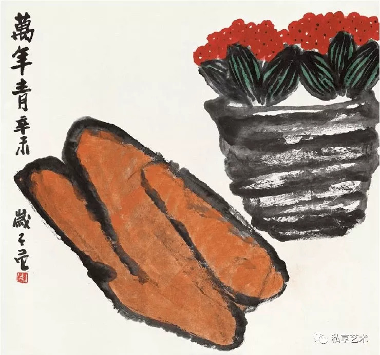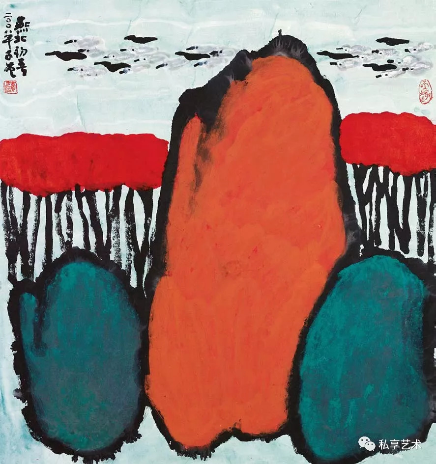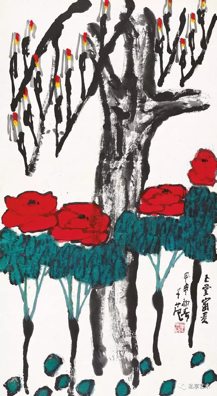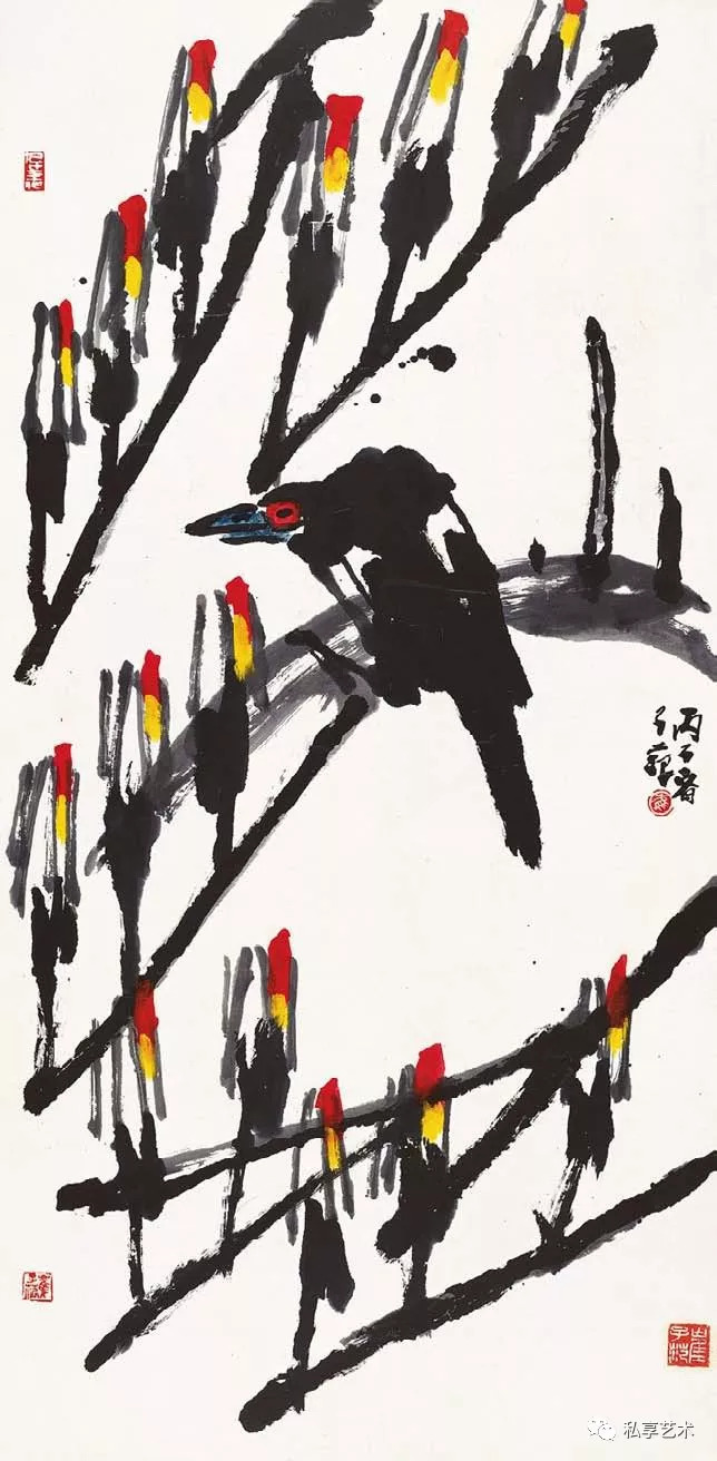 他用大黑大白,大红大绿,大块面,大笔触的用笔,拙重雄浑的画作,浓重而又质朴率真,或泼墨淋漓,或浓墨重彩,醇厚洗练,具有极强的形式感。他构图巧妙,画面单纯,墨彩浓厚润泽而绚丽,笔触奔放,拙朴深厚,平中求奇。他的画不以画面表面的流利华美取悦于读者,而是巧妙的把民间艺术的那种单纯、明快亲切动人的精神和内在的幽默感及民间艺术特有的稚拙美渗透在自己的画境中,同时他把传统笔墨与对齐白石艺术精华有着独到的“悟性”融而会之,从而创造出他独特强烈粗犷的造型风格特征。