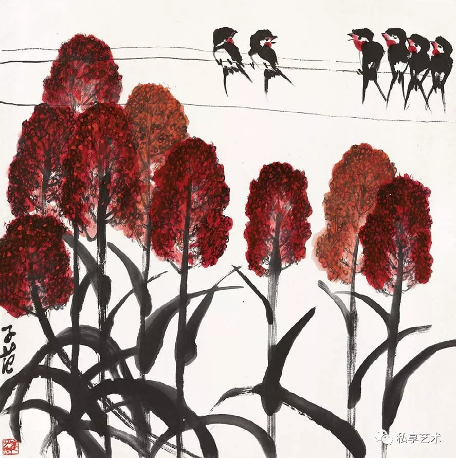 他对故乡的农村生活有着深深的感情,玉米、高粱等这类古人很少涉及的农作物题材也涌现在他的作品中。中国花鸟画史上称“徐熙野逸,黄荃富贵”,而崔老用他日常所见的物象情景,直观的生活感受,激发出源自肺腑的深厚感情,歌颂伟大的时代和人民的美好生活。