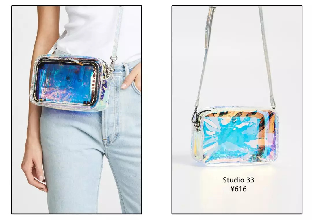 或者买看不太清楚里面装什么的透明包,比如这种七彩镭射PVC材质做的,本身就不容易过时,搭配T恤牛仔背很有腔调。