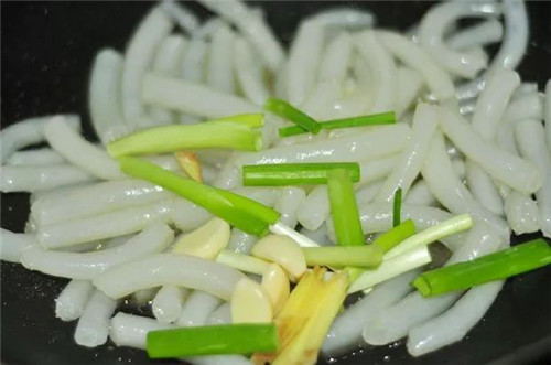 2.煸炒一下后下入鲟鱼筋翻炒,加入适量的料酒和生抽;